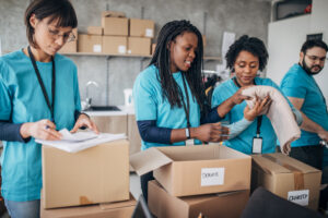Diverse volunteers packing donation boxes in charity food bank
